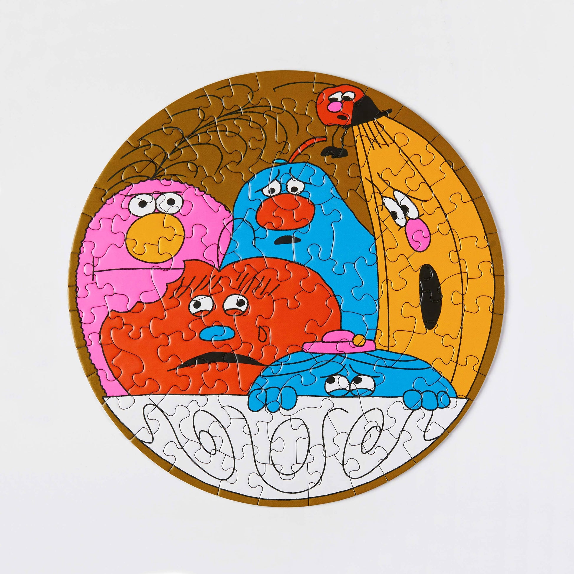 An 81-piece mini puzzle from Le Puzz, featuring an illustration by Angela Kirkwood. Something is afoot in this friendly fruit bowl. Why does everyone look so concerned? Who took a bite from Mr. Apple? A mystery of sorts and a Fruity Fiasco for sure!